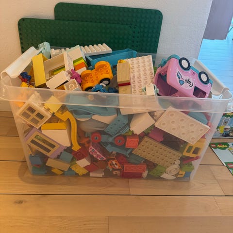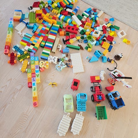 Ca 5 kg blandat duplo inkl flera fordon, figurer och djur, se bild. Blandad ålder, använt av 1-4 barn men bra skick på allt. Djur- och rökfritt hem. Finns på Nilstorp i Lund.