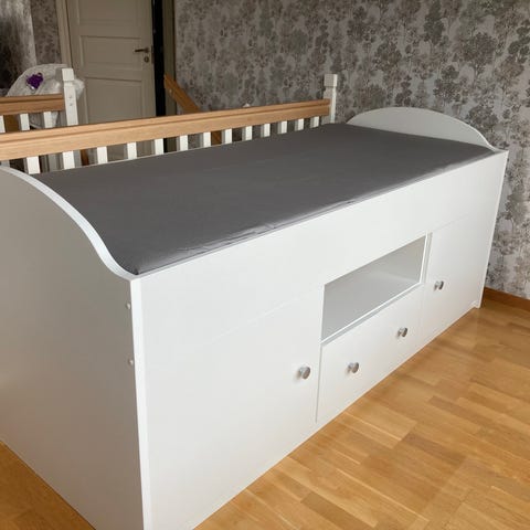 The two storage compartments behind the sliding door have a width of 104 cm and a height of 26 cm. The height of the mattress is 17 cm.