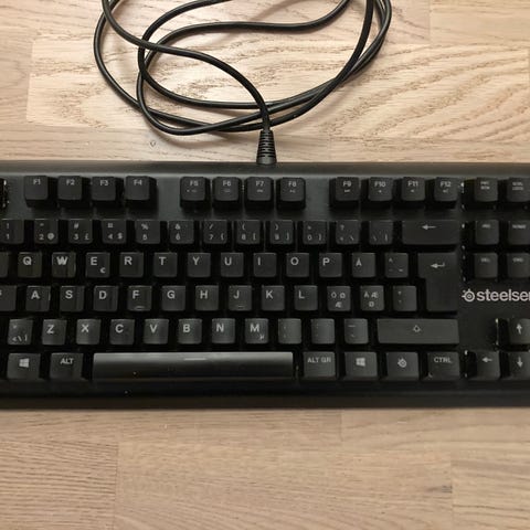 SteelSeries tangentbord med standardtangentbordslayout. Produkten är svart och inkluderar en handledsstöd. Används för datorstyrning och mer