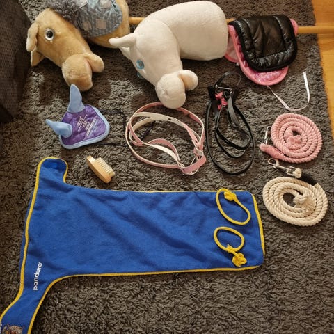 Superfint litet stall med plats för flera käpphästar från Panduro. Dottern fick det precis då hon slutat leka med käpphästar så det har bara stått. Käpphästarna samt grimman ingår i köp.