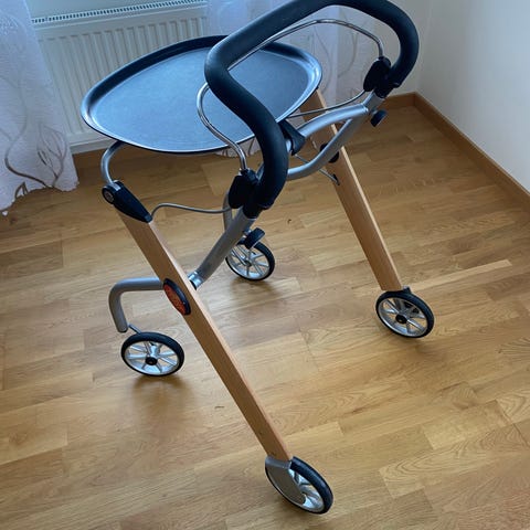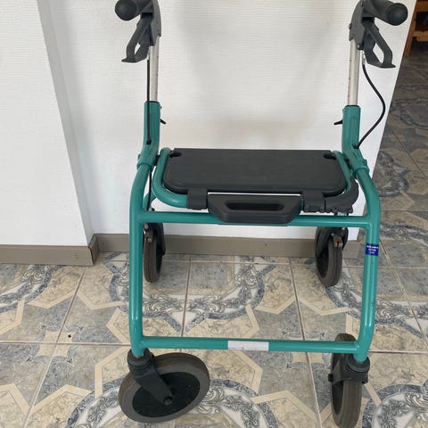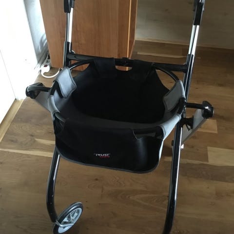 Trust Rollator i röd färg med fyra hjul och justerbara handtag. Utrustad med en förvaringsväska under sitsen för att bära personliga föremål eller inköp. Designad för att ge stöd och stabilitet vid gång. Passar för inomhus- och utomhusbruk.