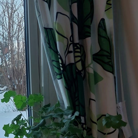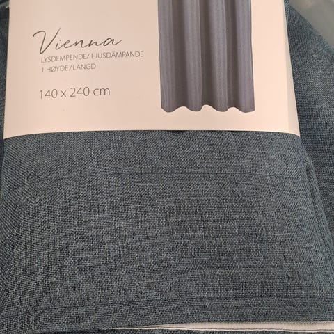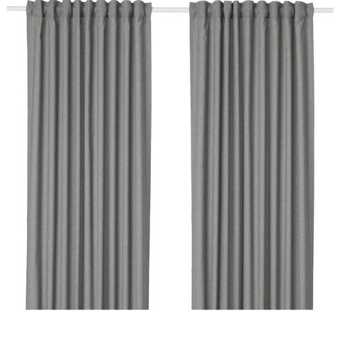 1 par långa gardiner med multiupphängning. Grå i linne eller linnemix. Tyvärr är lappen borta så vet inte säkert om det bara är linne 144x250 i fint skick