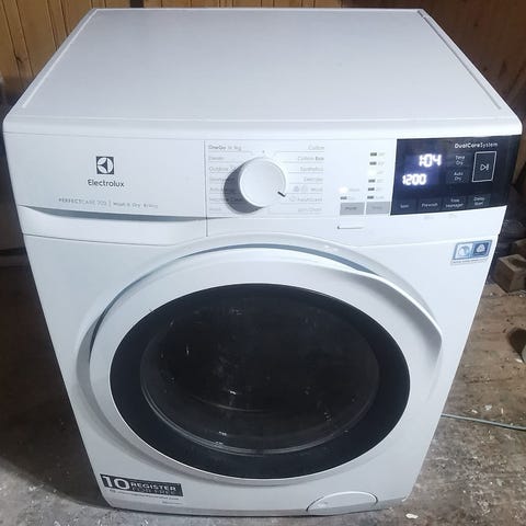 Kombinerad tvättmaskin/torktumlare med frontmatning. Maskinen är utrustad för både tvätt och torkning i en enhet, vilket sparar utrymme och tid. Vit färg och standardstorlek för hemmabruk.