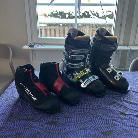 1-par slalompjäxor Solomon 27,5, pris 800kr, längdpjäxor Salomon STL. 43 och stl. 42 pris 300kr per par