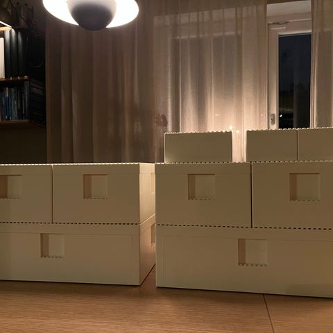 LEGO förvaringslådor formade som byggklossar och en skalle. Innehåller flera delar i svart, grått och vitt. Används för förvaring och organisering av småsaker. 11 stycken lådor totalt.