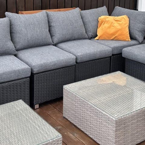 Utemöbelset med soffor och bord i svart metall och beige dynor