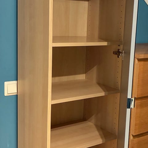 Ikea-garderob med mässingshandtag och tapet.