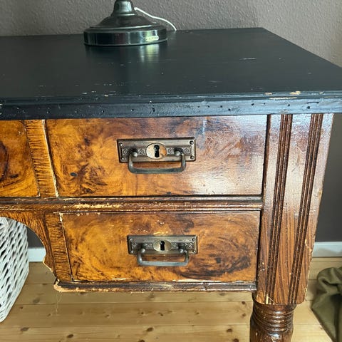 Antikt skrivbord med grön läderyta och tre lådor. Bordet har snidade ben och en träfinish. Passar för användning som arbetsbord eller skrivbord i hem eller kontor.