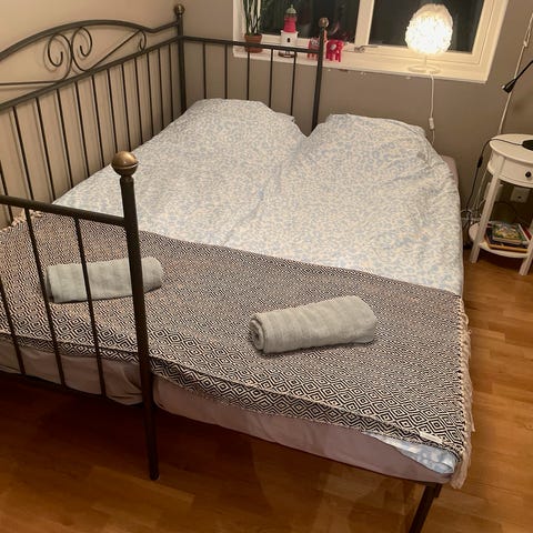 Kommentar: En bräda i undersängen är av (lagad med silvertejp).