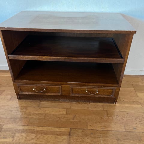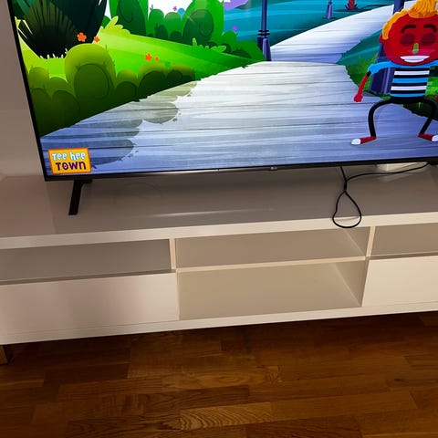Ett TV-bänk med gott om plats och förvaringslådor.Svartmålat trä,