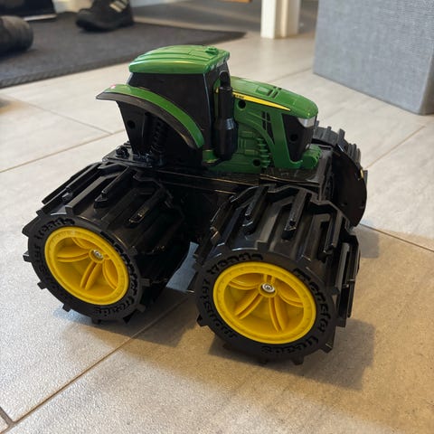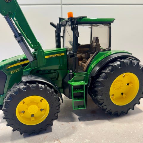Bruder John Deere Traktor med tippvagn i grön färg.