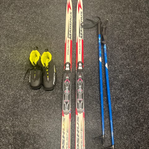 Madshus Kid Race skidor, Madshus Karhu Touring pjäxor stolek 32 och stavar. Allt i fint skick som du kan se på bilderna.