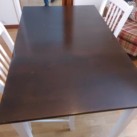 Ljust trä, troligen björk, fanerad skiva, massiva ben. Alltid haft duk på, varför ytan är felfri. Mått: längd 150(+50), bredd 84, höjd 72 cm. Ena sidans ben med hjul, varför lätt att flyttas på golvet vid behov, benen avtagbara. Stadigt och praktiskt bord för upp till 8 personer.
