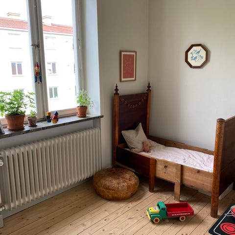 Utdragbar gammal barnsäng. Mått i detta format 125x65 cm. Målad i en gråblå nyans, små skavanker finns. Fint använt skick.