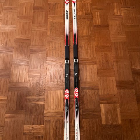 Längd på skidor 196 cm (grundregler är att skidorna ska vara ca 20-30 cm längre än kroppslängd).