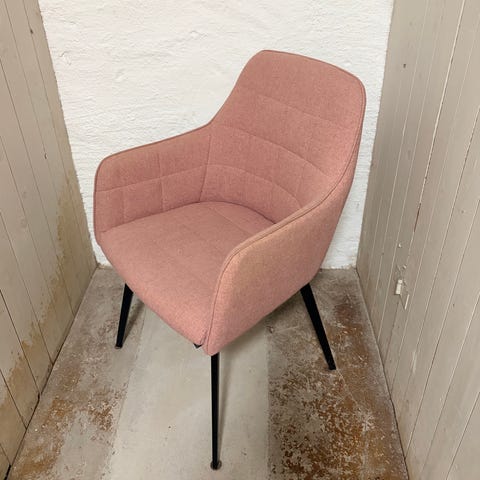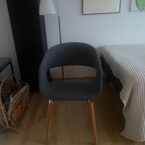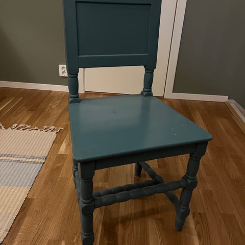 En skön stol med armstöd. Klädd i slitstark material i blått. Fina träben. Behöver torkas av /rengöras enkelt på ärmstöd och rygg.