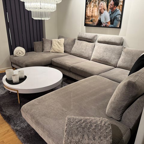 Vi säljer nu vår bekväma grå hörnsoffa Saturday XL från Mio. Två stycken nackkuddar ingår. Mycket fint skick, rökfritt hem och inga fläckar.