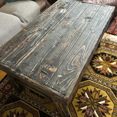 Hemmabyggt soffbord i vitsåpade furuplank.