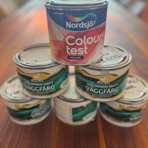Fyra burkar med NCS färgprover i olika nyanser: NCS S 1020-Y90R, NCS S 0515-R80B, NCS S 2020-B90G och Jotun 1623 Marrakesh. Varje burk innehåller färgprover för användning vid färgsättning och inredning. Inköpt under julhelgen för prov målning av vägg. Priser är 4 burkarna, lite färg tagen ur varje burk.