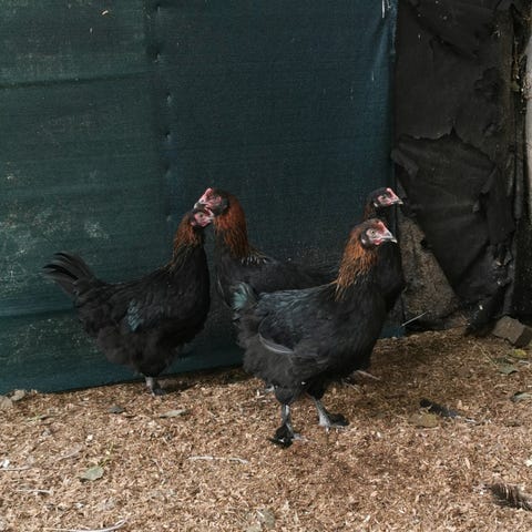Silverudds Blå-hönan är svart och har ruggat och kommer snart börja värpa. Dessa tre renrasiga hönor är runt 2 år. Den fjärde är en unghöna, ca 6 månader, svart med brun krage och är en blandning av Lohman och något mer.
