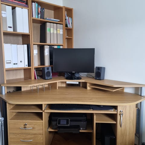 Ett stycke vändbart hörnskrivbord säljes pga det passade helt enkelt inte så bra här hemma. Haft det sen slutet på sommaren ungefär. Inbyggd förgreningsdosa med två uttag och två usb, klassisk rgb-ledstrips under hyllan. Har monterat ned och märkt upp alla delar och skruvar enligt manualen (som naturligtvis medföljer) så det ska gå så smidigt som möjligt att montera upp hemma hos dig.