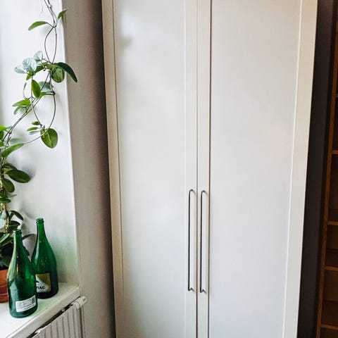 IKEA garderob med mörkbrun finish, utrustad med hyllor, metallkorgar och klädstång för förvaring av kläder och tillbehör