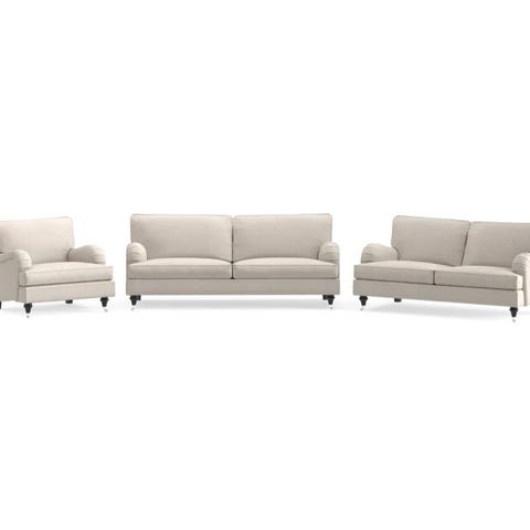 Oxford soffgrupp med tyget Sofia Cream med valnöt/mässings ben/hjul. För mått hänvisas till Mios hemsida.