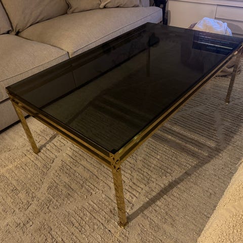 Soffbord med marmorimitation och glasskiva. Utställda ben med mässingsimitation längst ner.