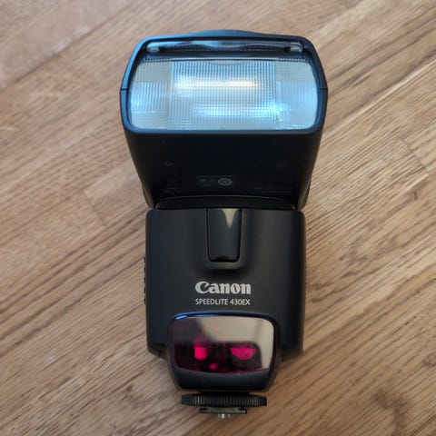 Canon Speedlite 430EX III-RT blixt med trådlös radiostyrning. Kompatibel med Canon-kameror, används för att förbättra belysningen vid fotografering. Har justerbar blixthuvud och LCD-display för inställningar.