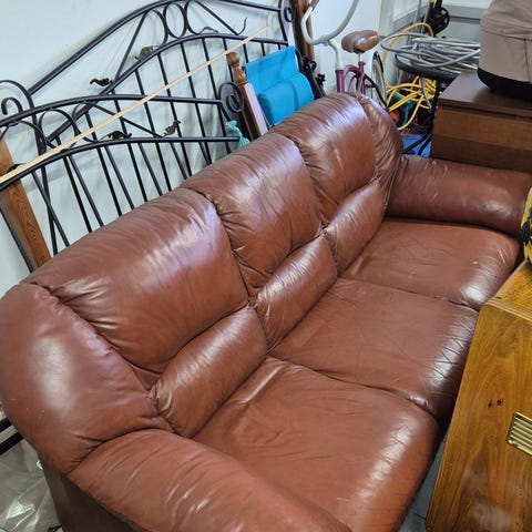 Soffgrupp i mörkblått skinn, inkluderar en 3-sitsig soffa och två fåtöljer (Varav en är utfällbar).