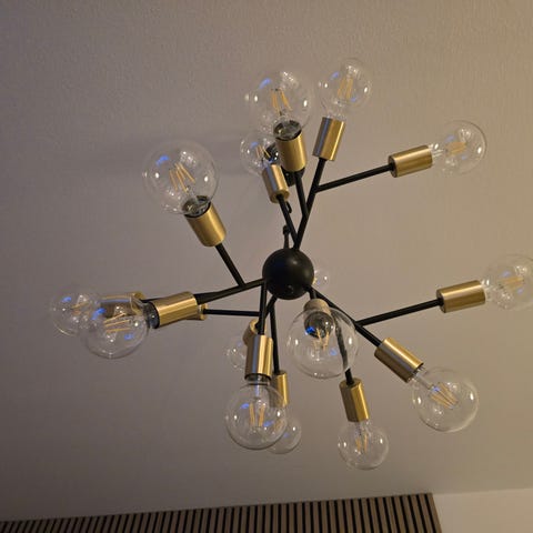 Taklampa Heroes med 24 st matta mässingslamphållare. Kabeln är i svart textil och är 120 cm, takkopp i svart metall. Ø80 mm, höjd 50 mm. Ljuskällor ingår.