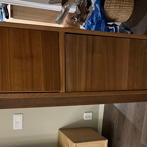 Skåpet går att använda som det är men på den högra luckan har ett fäste gått sönder vilket gör att luckan hänger lite löst. Detta syns inte varken när luckan är stängd eller uppfälld.
