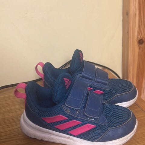 Adidas barnskor i storlek 24. Små skönhetsfel, såsom skrap på tyget, se bild (ej hål). Synligt använda, men efter en tvätt kan de lätt funka en säsong till. Skickas enbart.