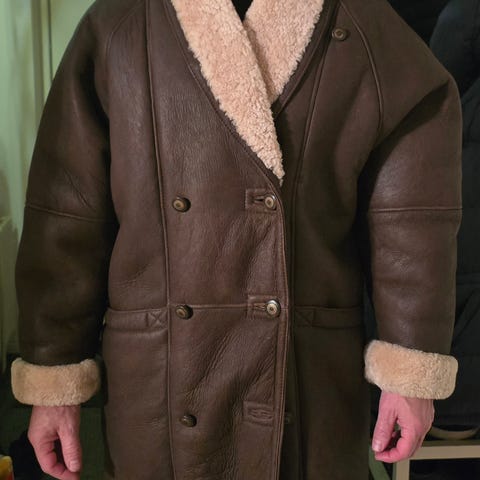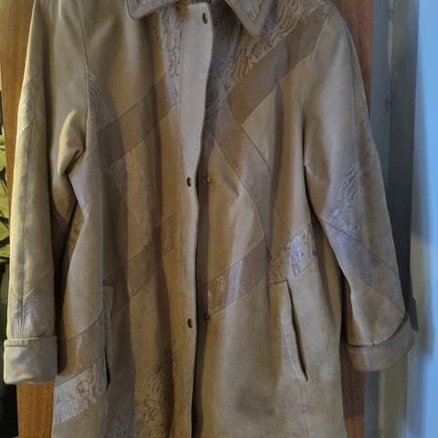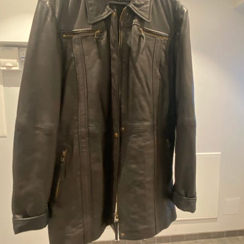 Svart dam skinnjacka i storlek 50 aldrig använd. Har en luva med svart päls som går att ta av om man önskar. Jacka är lång modell och mäter jag från luvan på ryggen ca 84 cm till neder kant. Har dragkedjor på armarna. Märket är Glassly