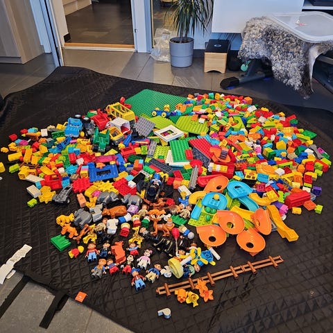 Stor grön platta, mindre stora plattor ingår, även ytterligare bitar som inte ingår i något set finns i påsen. Alla manualer finns att hitta på legos hemsida genom att ange produktens artikelnummer (syns på bilderna och är engett nedan). Enkelt att skriva ut eller spara ned på telefon.