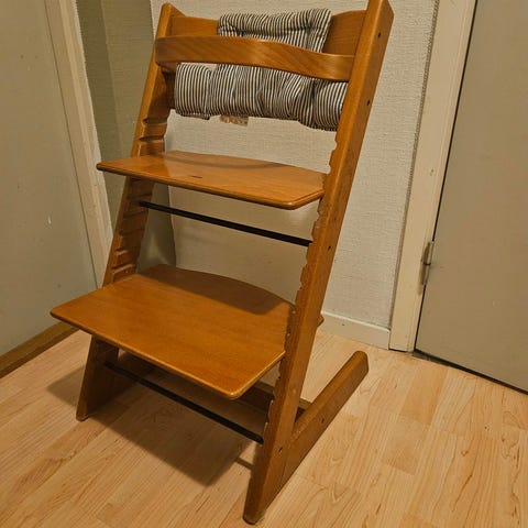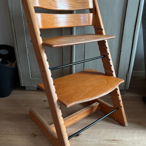 Tripp trapp stolar i furu 2st. 1 med bygel den andra saknar.