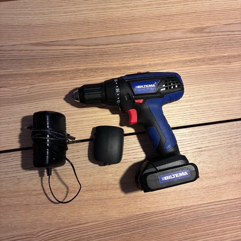 Biltema slagborrmaskin och skruvdragare set i blå färg. Batteridrivna verktyg med ergonomiskt handtag och laddningskablar inkluderade. Passar för borrning och skruvdragning i olika material. Priset avser båda maskiner. OBS. En laddare.