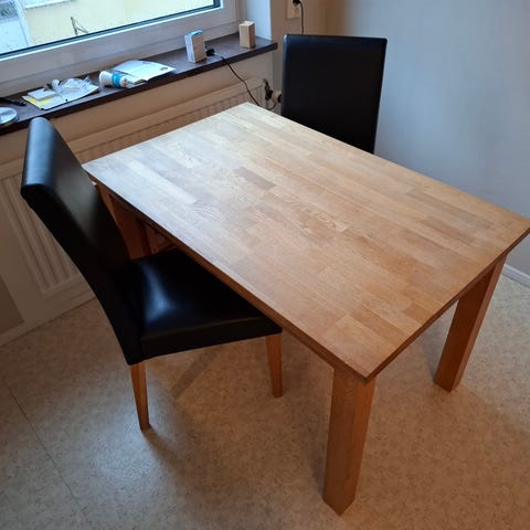 Fint lite äldre matbord med sina små skavanker, kan även fås med 4 st stolar i okej skick.