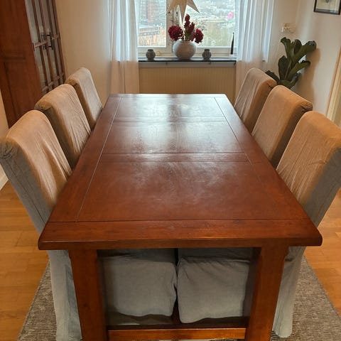 6 st stolar i antikek med grått överdrag som enkelt går att ta av. Pris 500.- st