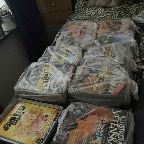 14 nummer av Illustrerad Vetenskap från 2025, 13 av dem oöppnade med skyddsplasten kvar.