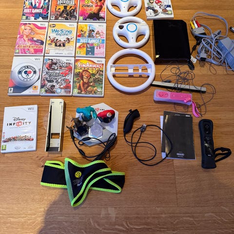 Nintendo Wii spelkonsol inklusive olika tillbehör som styrkonsoler, rattar, balansbräda och flera spel. Spelen som ingår är bland annat Just Dance, Mario Kart, och Wii Sports. Systemet är kompatibelt med Nintendo Wii-spel och erbjuder interaktiv underhållning.