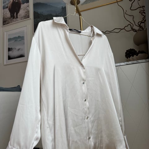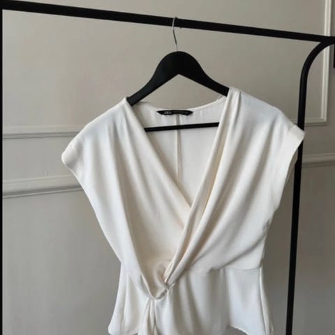 Säljer en elegant satinblus från Zara i vacker korallröd färg med mjuk glans. Blusen har en smickrande V-ringning/omlottdesign och långa ärmar med fint fall.