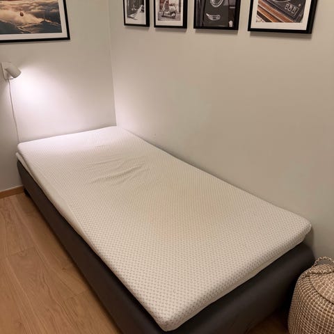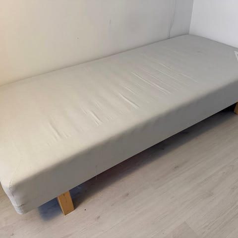 Bortskänkes säng 90 x 200. Höjd 45 cm inklusive ben. Mjuk modell som passar personer under 50 kg. Bäddmadrass ingår ej.