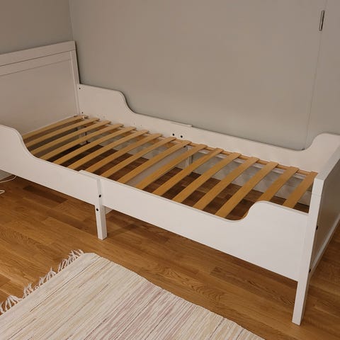 Sängarna har legat i en sängram varför de säljs utan ben men i varje hörn sitter en platta monterad för ben att skruvas fast i. Se bild 8.