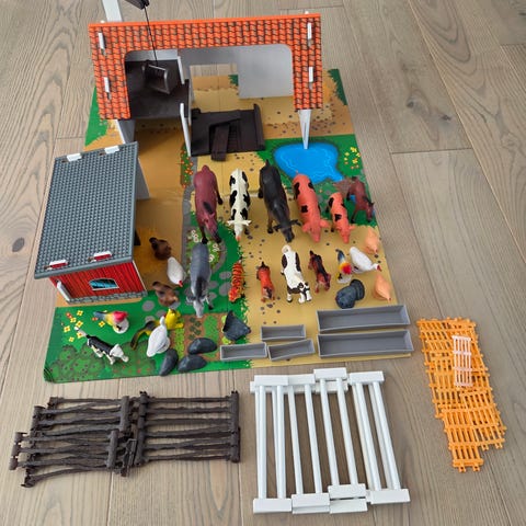 Playmobil Bondgård lekset som innehåller olika djurfigurer såsom hästar, kor och får samt flera tillbehör som staket, träd, och figurer av människor. Setet är tillverkat av plast och är avsett för barn. (Fattas från originallådan av figurer en mus, en get, en nappflaska, samt en höbal). Men finns med en extra gubbe och häst, samt morötter)