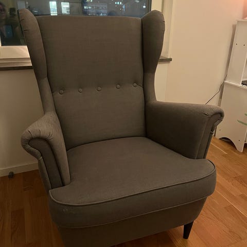 Strandmon fåtölj från IKEA i skiftebo gul färg i bra skick( som ny ) sparsamt använt .