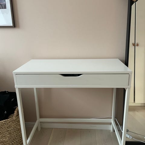 Säljer ett Alex skrivbord / Sminkbord från IKEA med en 80 cm bred och 15 mc djup "flytande" hylla till. Bordet är 100 cm brett och 48 cm djupt.