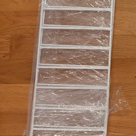 IKEA förvaringssystem delar bestående av vita metallstänger, vita metallkorgar och en vit toppen. Delarna är avsedda för användning som exempel garderob i ett modulärt förvaringssystem och är tillverkade av metall och trä eller träliknande material.