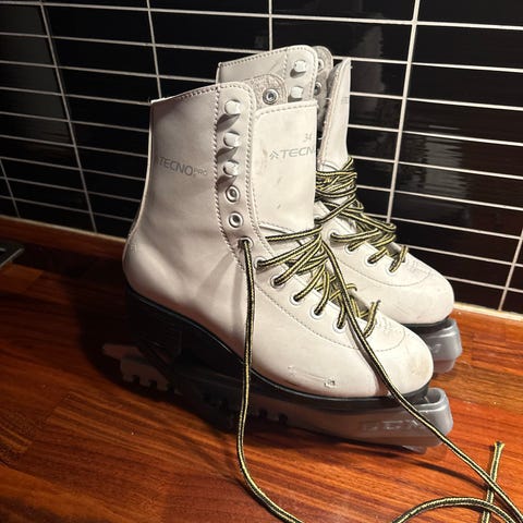 Tecnopro Övriga skridskor i barnstorlek 34. Skridskorna går att ändra i storlek med ett lätt tryck på den grå knappen och genom att föra den främre delen framåt. Stl 34-37. Skridskorna har en design i vitt och rosa, och är anpassade för barn. De är utrustade med spännen och snörning för justerbar passform.