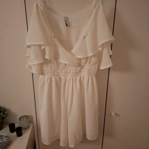 Vit byxdress krage och en unik asymmetrisk fåll. Har en markerad midja.
